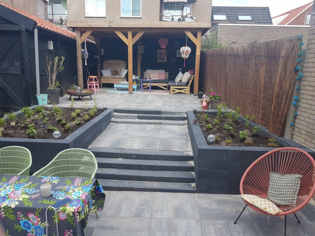 Deze achtertuin mochten we helemaal onder handen nemen, inclusief bestrating en overkapping.