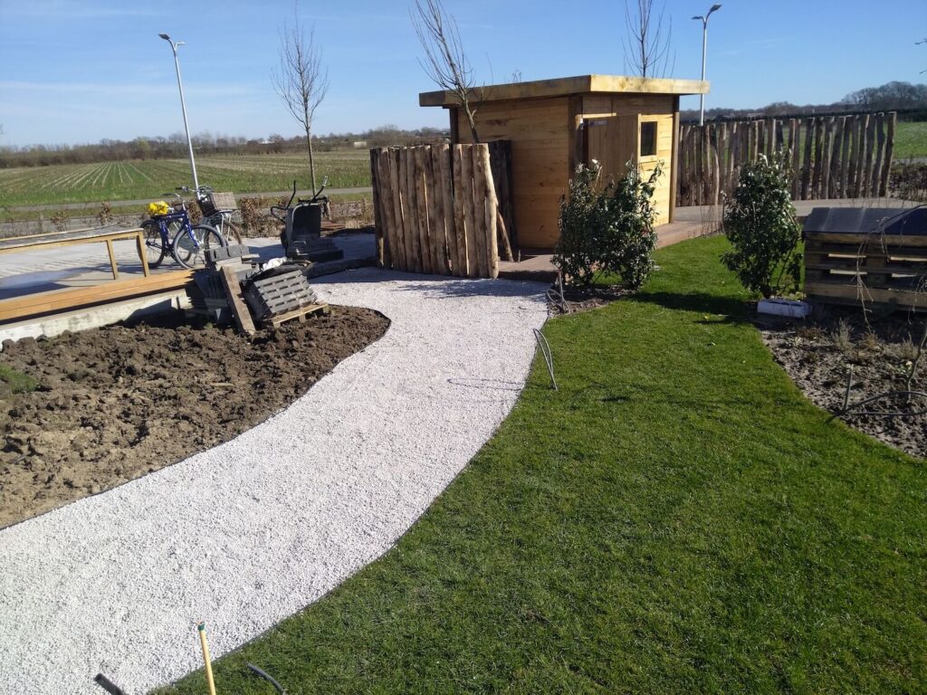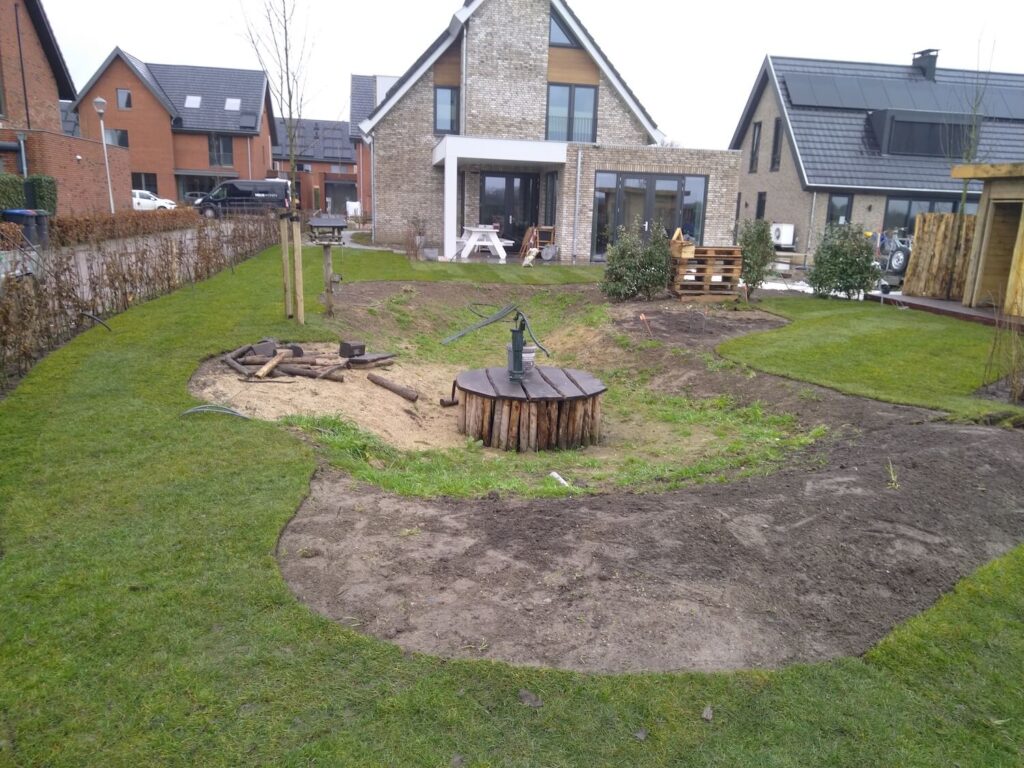 Momenteel zijn we bezig om dit project te realiseren. Een natuurlijke tuin met een wadi om het water natuurlijk op te kunnen vangen.